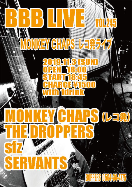 BBB LIVE 245 MONKEY CHAPS ¥ì¥³È¯¥é¥¤¥Ö 2019.11.3 (SUN) OPEN 18:00 START 18:45 CHARGE \1500 with 1drink MONKEY CHAPS (¥ì¥³È¯¡Ë THE DROPPERS sfz SERVANTS