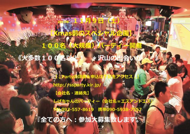 ☆☆☆☆☆☆パーティー詳細☆☆☆☆☆☆ ●11月9日(土):【Xmas前のスペシャル企画】100名(大規模)パーティー 《総参加予想は大多数80〜100名! *沢山の出会いがあります。》 ◎【お知らせ】本日のHPとメールの申込チェックは17:30で終了の為、以降は御電話(携帯へ)でのお申込をお願い致します。 《★直接、途中参加もOKです。★》 【会場】moon walk西中洲店(ムーン ウォーク) 【受付】19:40〜 【スタート】20:00〜22:30 【料金】女性1500円 男性3500円 (2ドリンク、ビュッフェ形式)