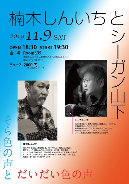 そら色の声とだいだい色の声 楠木しんいち Vo&G シーガン山下 Vo&G 2019年11月9日(土) OPEN 18:30 START 19:30 会場 Room335 京都市中京区材木町178-3先斗町日高ビル3F (木屋町三条下ル二筋目東入ル) 電話 0752117735 チャージ 2000円 (要: 別途2オーダー) 楠木しんいち 1957年 生まれ、高知県出身。1977年より京都に住み始め、関西フォークを聴き始める( → 中川五郎・古川豪・豊田勇造...)オリジナル曲も作り始め、1983年 ギターを持って ヒッチハイクの旅に出る、北海道〜九州へと。旅と京都