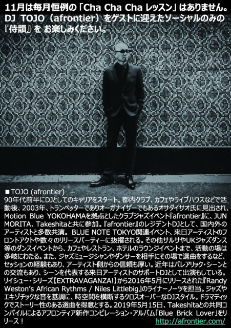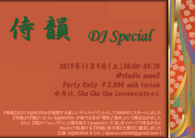 STUDIO PEPE2¤ÇÍðÉñ¤¹¤ë¡¡DJ S@MURAI¥ª¡¼¥¬¥Ê¥¤¥º¥¤¥Ù¥ó¥È¡Ø»ø±¤¡Ù¡¢ 2019ǯ11·î¤Ï9Æü(ÅÚ) ³«ºÅ¤Ç¤¹¡£ ¹¥É¾Äº¤¤¤Æ¤¤¤ë¡ÖCha Cha Cha¡×¤Î¥ì¥Ã¥¹¥ó¤Ï¡¢º£²ó¤Ï¤ªµÙ¤ß¤È¤·¤Þ¤¹¡£ ¥²¥¹¥ÈDJ¤ËTOJO¡ÊAfrontier¡Ë¤ò·Þ¤¨¤Æ¤ÎDJ¥¹¥Ú¥·¥ã¥ë¤È¤·¤Þ¤·¤¿¡£ 20»þ¤«¤é¥½¡¼¥·¥ã¥ë¥¿¥¤¥à¤òËþµÊ¤·¤Æ¤¯¤À¤µ¤¤¡£ ¡Ø»ø±¤¡Ù¤ÏDJ S@MURAI¤¬Ä󰯤¹¤ëº£¤Þ¤Ç¤Ë¤Ê¤¤¥µ¥ë¥µ¥¤¥Ù¥ó¥È¤È¤·¤Æ2009ǯ¤Ë¥¹¥¿¡¼¥È¤·¤Þ¤·¤¿ ¡Ø»ø±¤¡Ù¤Î¡Ø±¤¡Ù¤Ë¤Ï DJ S@MURAI ¤¬ÁդǤ벻¤Î¡Ö¶Á¤¡×¡Ö¿§¡×¡Ö¤ª¤â¤à¤¡×¤È¤¤¤¦°Õ¤ò¹þ¤á¤Þ¤·¤¿ ¤µ¤é¤Ë ¡Ø±¤¡Ù¡á¡Öinn¡×¤ä¡Öin¡×¤ÈÃÖ¤´¹¤¨¤Æpepe2¤È¤¤¤¦¡Ö