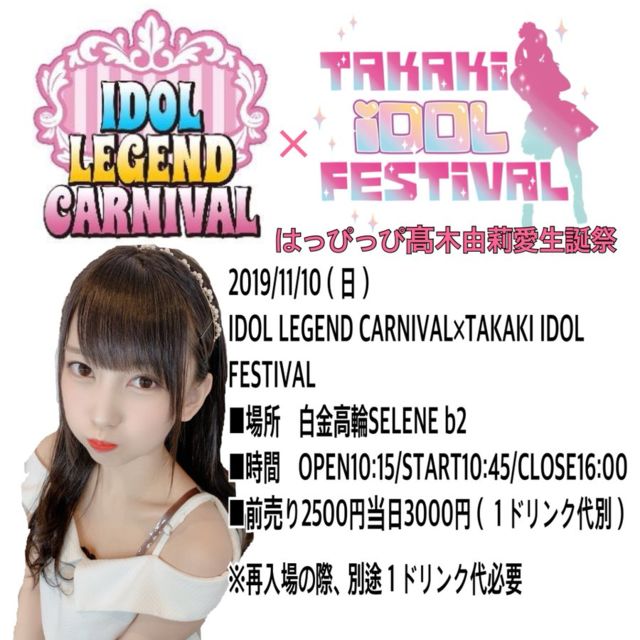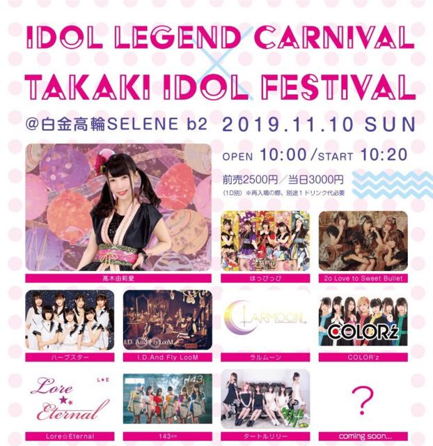 ¡ÖIDOL LEGEND CARNIVAL¡ßTAKAKI IDOL FESTIVAL¡×¡Á¹âÌÚͳ轰¦À¸ÃºסÁ Æü»þ¡§11/10(Æü) ³«¾ì10:00 / ³«±é10:20 ²ñ¾ì¡§Çò¶â¹âÎØSELENE b2 ÎÁ¶â¡§Á°Çä2,500±ß / ÅöÆü3,000±ß (DÊÌ) ¢¨ºÆÆþ¾ì²Ä(Í×1D) ½Ð±é¡§üâÌÚͳ轰¦/¤Ï¤Ã¤Ô¤Ã¤Ô/2o Love to Sweet Bullet/¥Ï¡¼¥×¥¹¥¿¡¼/I.D.And Fly LooM/¥é¥ë¥à¡¼¥ó/COLOR'z/Lore¡ùEternal/143¢æ/¥¿¡¼¥È¥ë¥ê¥ê¡¼/¡Ä