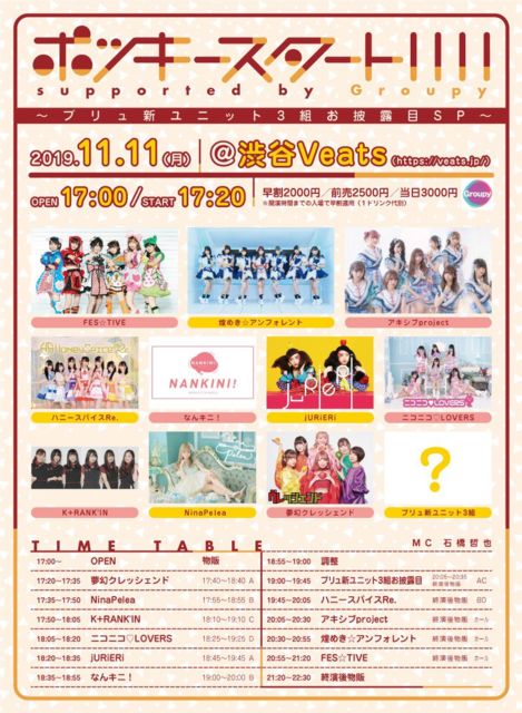 ¡Ö¥Ý¥Ã¥¡¼¥¹¥¿¡¼¥ÈIIII supported by Groupy¡× Æü»þ¡§11/11(·î) ³«¾ì17:00 / ³«±é17:20 ²ñ¾ì¡§½ÂëVeats¡¡½Âë¶è±§ÅÄÀîÄ®33ÈÖÃÏ1¹æ¡¡¥°¥é¥ó¥ÉÅìµþ½Âë¥Ó¥ëB1¡¦B2 ÎÁ¶â¡§Áá³ä2,000±ß / Á°Çä2,500±ß / ÅöÆü3,000±ß (DÊÌ) ½Ð±é¡§¥×¥ê¥å¿·¥æ¥Ë¥Ã¥È3ÁÈ/FES¡ùTIVE/ßê¤á¤¡ù¥¢¥ó¥Õ¥©¥ì¥ó¥È/¥¢¥¥·¥Öproject/¥Ï¥Ë¡¼¥¹¥Ñ¥¤¥¹Re./¤Ê¤ó¥¥Ë¡ª/jURiERi/¥Ë¥³¥Ë¥³♡LOVERS/K+RANK'IN/NinaPelea/Ì´¸¸¥¯¥ì¥Ã¥·¥§¥ó¥É ½Ð±é¡§19:00¡Á19:45 (¤Î¤¦¤Á15ʬ´Ö) ʪÈÎ ¡20:05¡Á20:35¡¡¢½ª±é¸å21:20¡Á21:30