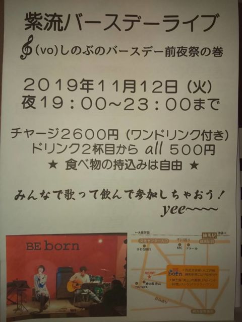 練馬music & live bar BEborn 本日、11月12日(火曜日)は、 【紫流バースデー貸切パーティー】 ♬ボーカルしのぶの前夜祭バースデー♬ open 19:00 end. 23:00 charge 2,600円 (1ドリンク付) パーティー参加申し込み先 SHINO-w-k-k@t.vodafone.ne.j 明日、11月13日(水曜日)は、 【店休日】 ※食べ物持ち込み自由です。 ゴミはお持ち帰りお願いします。 飲み物は、お店でご注文お願いします。 <br /> ★お気楽ライブ(ノルマ無し)出演者募集中! 2020年 1月11、12、18、19、25、26日 2月1、2、8、9、11、16、22、23、2