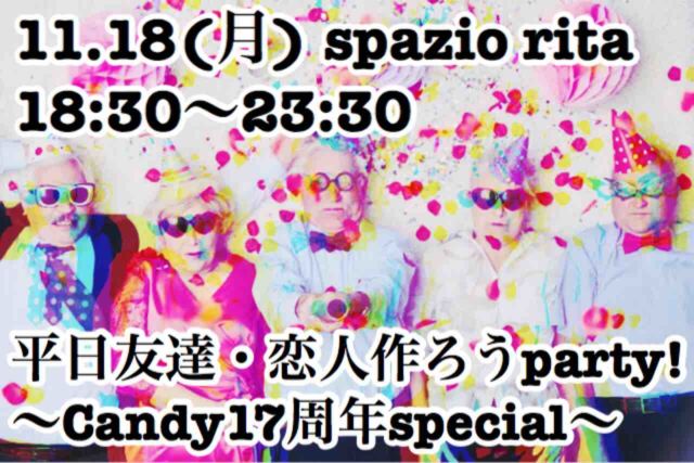 11.18(月) 平日 友達・恋人作ろうparty! 〜Candy17周年special!〜 時間→18:30〜23:30 料金→1700円(1D+ブード付) 追加ドリンク500円〜 会場→spazio rita 名古屋市中区栄5-26-39GS栄ビルB1 予約なしで誰でも参加OK♀ 平日休みの方の出会いやお友達作りに、お仕事帰りの食事や飲み友達募集など。 お一人様・初めての方大歓迎 ふらっと気軽に参加してみてね ラブトラのラブリングシステムあります 当日はラブトラの映像や写真、昔のフライヤーなどを展示しまーす 2次
