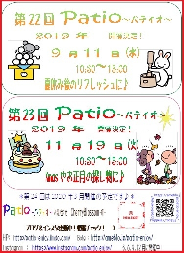 Patio¡Á¥Ñ¥Æ¥£¥ª¡Á¼çºÅ ¡Ö£Ã£è£å£ò£ò£ù£Â£ì£ï£ó£ó£ï£í¡Áºù¡Á¡×¡¡ ËÜÆü¤Î¥Ö¥í¥°¹¹¿·¤ÏMOE¤Ç¤¹ ¡ÖÂ裲£³²ó¡¡Patio¡Á¥Ñ¥Æ¥£¥ª¡Á¡×¤Î¤ªÃΤ餻¢ö ͽ¹ðÄ̤êÂ裲£³²óPatio¡Á¥Ñ¥Æ¥£¥ª¡Á ¤ò °Ê²¼¤ÎÆüÄø¤Ç³«ºÅÃפ·¤Þ¤¹¡ª º£²ó¤â³Ú¤·¤¤Ê·°Ïµ¤¤Ë¤Ê¤ë¤è¤¦¤Ë¿´³Ý¤±¤¿¤¤¤È»×¤¤¤Þ¤¹(*^_^*) ¾Ü¤·¤¯¤Ï¥Ñ¥Æ¥£¥ª¤Î¥Ö¥í¥°¤ò¤´Í÷¤¯¤À¤µ¤¤¤Í¡ù http://ameblo.jp/patio-enjoy/ ¡ú¤ª¤¦¤Ásalon±þ±ç¥¤¥Ù¥ó¥È¡ú Â裲£³²óPatio¡Á¥Ñ¥Æ¥£¥ª¡Á³«ºÅ·èÄꡪ 2019ǯ£±£±·î£±£¹Æü¡Ê²Ð¡Ë £±£°¡§£³£°¡Á£±£µ¡§£°£° ½ÕÆü»Ô¤Õ¤ì¤¢¤¤Ê¸²½¥»¥ó¥¿¡¼£±F¡¡¥®¥ã¥é