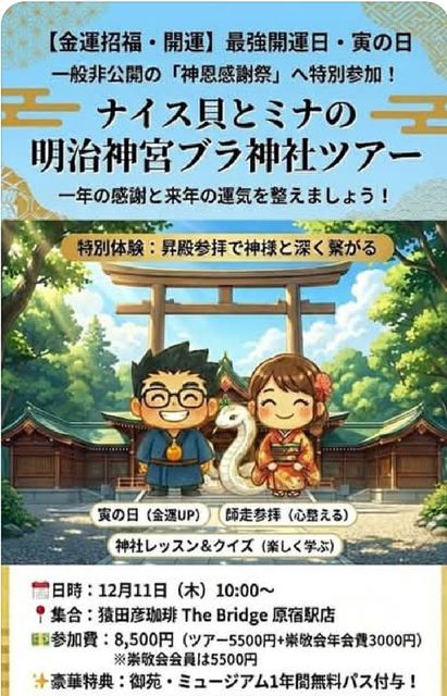 ¤³¤ó¤Ð¤ó¤Ï¡£ 12·î11Æü¡ÊÌڡˤˡ¢ÌÀ¼£¿ÀµÜ¤Ç¹Ô¤ï¤ì¤ë¡Ô¿À²¸´¶¼Õº×¡Õ¤Ë ÆÃÊÌ»²²Ã¤Ç¤¤ë¥Ö¥é¿À¼Ò¥Ä¥¢¡¼¤ò³«ºÅ¤·¤Þ¤¹⛩ °ìÈÌ¤Ç¤ÏÆþ¤ë¤³¤È¤¬¤Ç¤¤Ê¤¤¾ºÅ»²ÇҤˤ´°ÆÆâ¤Ç¤¤ëµ®½Å¤ÊÆü¤Ç¤¹¡£ ¶Æâ¤Ç¤Ï¡¢¥ß¥Ë¥¯¥¤¥º¤ä´Êñ¤ÊÀâÌÀ¤ò¸ò¤¨¤Ê¤¬¤é¡¢ ¤æ¤Ã¤¿¤ê¤È½ä¤ê¤Þ¤¹¡£ Æü»þ 12·î11Æü¡ÊÌÚ¡Ë10:00¡Á13:00º¢ ½¸¹ç ±îÅÄɧàÝàê The Bridge ¸¶½É±ØÅ¹¡Ê¸¶½É±Ø¤¹¤°¡Ë »²²ÃÈñ 5,500±ß ¢¨¿ò·É²ñ¤ÎÆþ²ñ¤¬É¬ÍפǤ¹¡Êǯ²ñÈñ3,000±ß¡Ë¡£ ¢¨´û¤ËÆþ²ñºÑ¤ß¤ÎÊý¤ÏÄɲÃÈñÍѤÏÉÔÍפǤ¹¡£ ÆÃŵ ¡¦