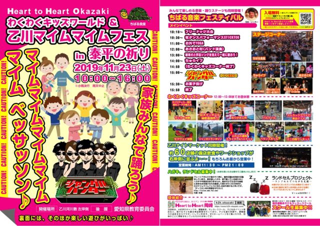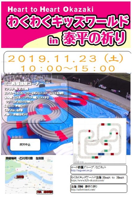 乙川河川敷にてミニ四駆コースを設置 雨天中止 10時〜14時30分 フリー走行 コース利用料 チケット200円 貸出しミニ四駆(走行毎に返却) 持参ミニ四駆走行可 パーツ販売無し 電源無し 詳細 http://www.nagonet.jp/ 岡崎太平の祈り http://taihei-inori.com/ HtoH https://www.h2h-okazaki.com