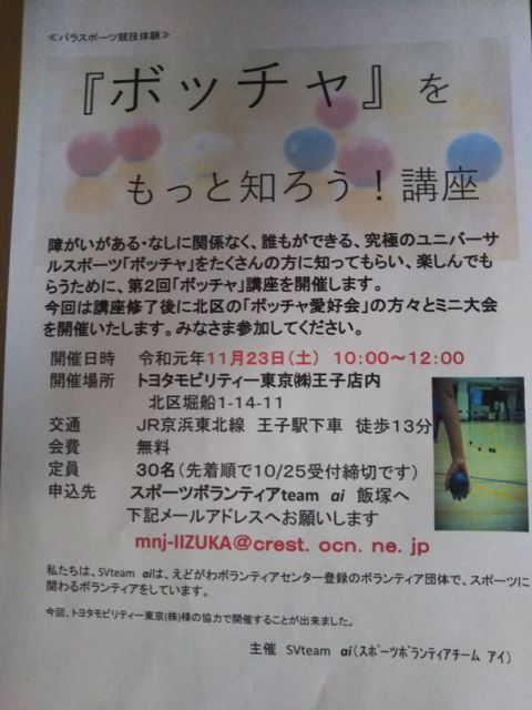 初めまして。 東京都江戸川区のボランティアセンターに登録して活動しております。 オリンピック、パラリンピック、デフリンピックなどの種目をはじめ、箱根駅伝、東京マラソン、現在開催中のラグビーなどで会員はスポーツボランティアをしているチームです。 会員は100名近くおりまして、会員は東京を中心に関東近郊の県から参加頂いております。 ボッチャの参加者募集をお願いしたくこちらの【ボッチャ広場】に参加させていただきました。 2020年パラリンピック競技種目でもある『ボッチャ』は小さいお子さんからシニア世代、障がいのあ