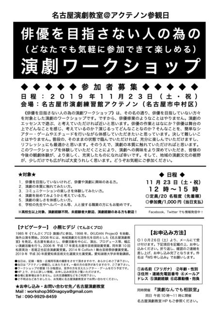 【参加者募集中】どなたでも気軽に参加できて楽しめる《俳優を目指さない人の為の演劇ワークショップ》を、今年もアクテノン参観日に開催します。只今参加者募集中です。たくさんの皆様のご参加、お待ちしています。 ----------- 《俳優を目指さない人の為の演劇ワークショップ》はその名の通り、俳優を目指していない方々を対象とした、演劇のワークショップです。ですから、俳優修業のようなことはやりません。演劇のエッセンスで遊ぶ、と考えていただければ近いと思います。 俳優の作業とはなにか?俳優は舞台の上でどんなことを感じ、考え