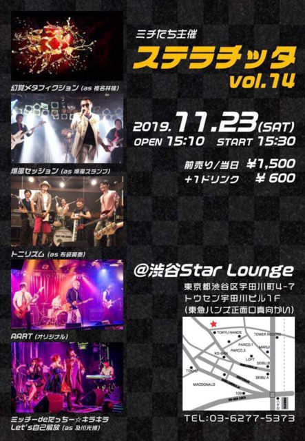 OPEN 15:10 / START 15:30 ¥Á¥ã¡¼¥¸1,500±ß¡Ü1¥É¥ê¥ó¥¯600±ß ½Ð±é 15:30¡Á ¸¸³Ð¥á¥¿¥Õ¥£¥¯¥·¥ç¥ó¡Êas ÄÇ̾ÎÓ¸é¡Ë 16:20¡Á ÇúÉ÷¥»¥Ã¥·¥ç¥ó¡Êas ÇúÉ÷¥¹¥é¥ó¥×¡Ë¢«¤³¤ì¤Ç¤¹ 17:20¡Á ¥È¥Ë¥ê¥º¥à¡Êas ÉÛÂÞÆÒÂÙ¡Ë 18:20¡Á AART¡Ê¥ª¥ê¥¸¥Ê¥ë¡Ë 19:20¡Á ¥ß¥Ã¥Á¡¼de¤¿¤Ã¤Á¡¼¡ù¥¥é¥¥éLet¡Çs¼«¸Ê²òÊü¡Êas µÚÀî¸÷Çî¡Ë ÇúÉ÷¥»¥Ã¥·¥ç¥ó½Ð±é¥á¥ó¥Ð¡¼ Vo.¤Ó¤ë¤´¤ë¤Ç¤£¡¢Gt.¤Þ¤µ¤æ¤¡¢Ba.¤Ê¤¤¤Á¡¢Dr.¤µ¤ï¤À¤ó ¤´Í½Ìó¤Ï¥á¥ó¥Ð¡¼¤Þ¤Ç ¤´Ï¢Íí¤¯¤À¤µ¤¤