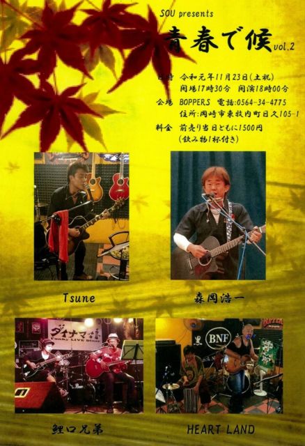 SOU presents 青春で候 vol.2 令和元年11月23日(土祝) 開場 17時30分 開演 18時00分 会場 BOPPERS 料金 前売り当日ともに1500円 1ドリンク付 森岡浩一 Tsune 鯉口兄弟 HEART LAND