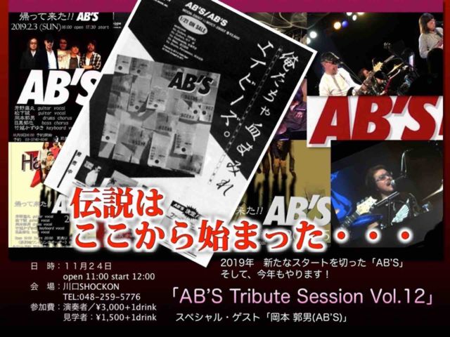 「2019 AB‘S Tribute Session Vol.12」開催のご案内 <曲、参加者一覧表> https://docs.google.com/spreadsheets/d/e/2PACX-1vT8Fn7eYj-30t2ZtUczL2BepudCix_awGfT6JTSZTFgixtJH9xU6k_NjIxMXiAf_EttQOGPub64Uw4g/pubhtml?gid=1683793096&single=true 「AB'S」な皆様!大変お待たせ致しました。 詳細が決定しましたのでご案内させて頂きます。 今年も、もちろん!「AB'S」のドラマー「岡本 郭男」さんがいらっしゃいます。そして、昨年は、なんと「芳野 藤丸」さんにもお越し頂き、演奏までして頂くという、夢のようなハプニングもありまし