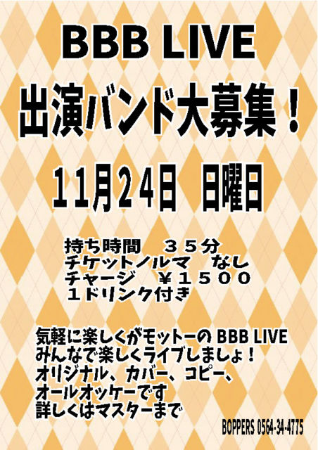 BBB LIVE ½Ð±é¥Ð¥ó¥ÉÂçÊ罸¡ª £²£°£±£¹Ç¯¡¡£±£±·î£²£´Æü¡¡ÆüÍËÆü »ý¤Á»þ´Ö¡¡£³£µÊ¬ ¥Á¥±¥Ã¥È¥Î¥ë¥Þ¡¡¤Ê¤· ¥Á¥ã¡¼¥¸¡¡¡ï£±£µ£°£° £±¥É¥ê¥ó¥¯ÉÕ¤ µ¤·Ú¤Ë³Ú¤·¤¯¤¬¥â¥Ã¥È¡¼¤ÎBBB LIVE ¤ß¤ó¤Ê¤Ç³Ú¤·¤¯¥é¥¤¥Ö¤·¤Þ¤·¤ç¡ª ¥ª¥ê¥¸¥Ê¥ë¡¢¥«¥Ð¡¼¡¢¥³¥Ô¡¼ ¥ª¡¼¥ë¥ª¥Ã¥±¡¼¤Ç¤¹ ¾Ü¤·¤¯¤Ï¥Þ¥¹¥¿¡¼¤Þ¤Ç