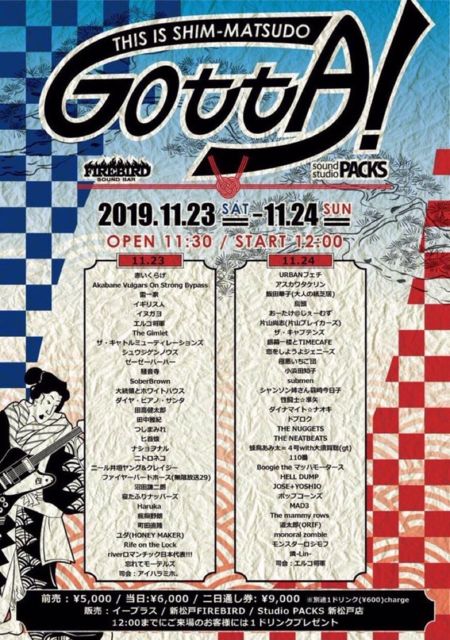 11·î24Æü(Æü) ÀéÍÕ¸© ¿·¾¾¸Í FIREBIRD http://www.aj-group.co.jp/firebird.html ¡ÖTHIS IS SHIM-MATSUDO GOTTA! 2019 DAY2¡× http://www.aj-group.co.jp/gotta/info.html ½Ð±é:Boogie the ¥Þ¥Ã¥Ï¥â¡¼¥¿¡¼¥¹etc... open11:30 start12:00 Á°Çä¤ê5000±ß ÅöÆü6000±ß 2ÆüÄ̤··ô9000±ß ¶¦¤Ë+1DRINK ¢¨Boogie the ¥Þ¥Ã¥Ï¥â¡¼¥¿¡¼¥¹¤Î½Ð±é¤Ï12¡§50¡Á¡ª