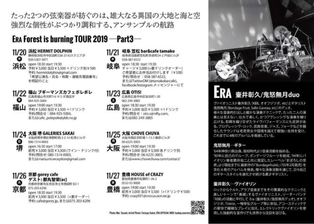 #ERA_LIVE ERA(壷井彰久vl,鬼怒無月g) 5th アルバム「Forest is burning」発売記念ツアー part3 ★2019/11/26(tue) ゲスト:都丸智栄(acc) at #京都 gorey cafe http://gorey.jp/cafe/ OPEN 18:30, START 19:30 予約¥3,000,当日¥3,500(+order) よろしくお願いします! こちらから視聴できます! https://youtu.be/j5qJAAzkJ4c #ギター #バイオリン #ライブ #live