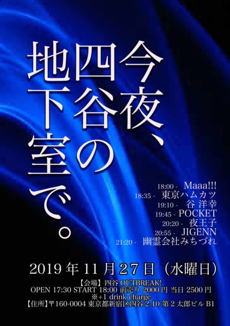 open/ 17:30 start/ 18:00 前売り予約/ ¥2,000+D代別 当日/ ¥2,500+D代別 (出演) JIGENN 幽霊会社みちづれ POCKET 夜王子 Maaa!!! 東京ハムカツ 谷 洋幸 ◎20:55から出演予定 ↓ご予約 https://jigenn.net/postmail/postmail1127.html