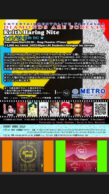 DIAMONDS ARE FOREVER vol.407 Keith haring nite 2019 11 29 fri 京都丸太町 metro DJ LaLa DJ kor DJ achapin シモーヌ深雪 フランソワ アルデンテ アフリーダ オー ブラート そよ風さん ショコラ ド ショコラ ブブ ド ラ マドレーヌ キャンディス&ロプロス 協力 Y gion 中村キース・へリング美術館 お越し頂いた皆さま ありがとうございました