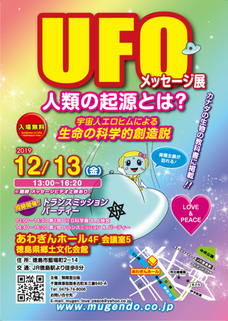 ★第1部「地球人は科学的に創造された」パネル展&上映会 【開場】13:00 【開演】13:00-14:40 どなた様もご自由にご入場できます♪ お気軽にお越し下さいませ(^-^)/ カナダの生物の教科書に掲載されました エロヒムによる科学的創造論をお伝えいたします。 ★第2部トランスミッション&パーティー♪♪♪ 【開演】 14:40-16:20 トランスミッションと は、創造者エロヒムのコンピューターに細胞の設計図 (個々人のDNA配列)を伝送するイベントです。 「宇宙人からのメッセージ