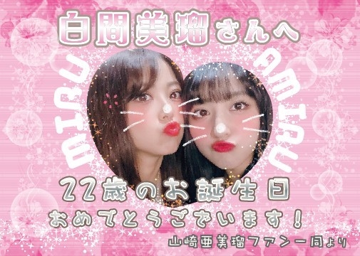 日頃より当コミュニティへのご理解ご協力を賜り、 誠にありがとうございます。 山崎亜美瑠コミュニティ管理人のきゅーぶれもんです。 2019年12月06日(金)、 白間美瑠さんの生誕祭が開催されます。 山崎亜美瑠さんにとって白間さんは 憧れの先輩であり、特別な存在として、 その絆を大切にしていきたいと思います。 そこで、当コミュニティより ささやかながらお祝いの気持ちを込めて お花をお贈りしたいと思います。 【内容】 花かご 【予算】 5,000円 みなさまのご理解ご協力よろしくお願い致します。