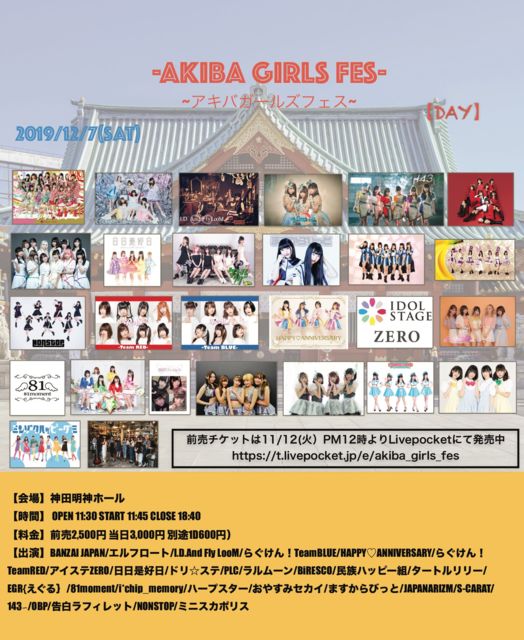 ¡ÖAKIBA GIRLS FES¡× Æü»þ¡§12/07(ÅÚ) ³«¾ì11:30 / ³«±é11:45 ²ñ¾ì¡§¿ÀÅÄÌÀ¿À¥Û¡¼¥ë ÎÁ¶â¡§Á°Çä2,500±ß / ÅöÆü3,000±ß (DÊÌ500±ß) ½Ð±é¡§¥¨¥ë¥Õ¥í¡¼¥È ¡¿BANZAl JAPAN ¡¿I.D.And Fly LooM ¡¿¤é¤°¤±¤ó¡ªTeamBLUE ¡¿HAPPY♡ANNIVERSARY ¡¿¤é¤°¤±¤ó¡ªTeamRED ¡¿¥¢¥¤¥¹¥ÆZERO ¡¿ÆüÆüÀ§¹¥Æü ¡¿¥É¥ê¡ù¥¹¥Æ ¡¿81moment ¡¿EGR{¤¨¤°¤ë¡Ñ ¡¿¥¿¡¼¥È¥ë¥ê¥ê¡¼ ¡¿Ì±Â²¥Ï¥Ã¥Ô¡¼ÁÈ ¡¿BiRESCO ¡¿¥é¥ë¥à¡¼¥ó ¡¿ PLC ¡¿ i*chip_memory ¡¿¥Ï¡¼¥×¥¹¥¿¡¼ ¡¿¤ª¤ä¤¹¤ß¥»¥«¥¤ ¡¿¤Þ¤¹¤«¤é¤Ó¤Ã¤È ¡¿JAPANARIZM ¡¿ S-CARAT ¡¿¥ß¥Ë¥¹¥«¥Ý¥ê¥¹ ¡¿NONSTOP ¡¿¹ðÇò¥é¥Õ¥£¥ì