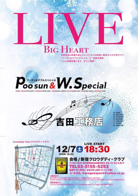 12/7 ËÜÆü¤Î¥é¥¤¥Ö¡¡ ¥×¡¼¥µ¥ó&¥À¥Ö¥ë¥¹¥Ú¥·¥ã¥ë & µÈÅĹ©Ì³Å¹ ¥é¥¤¥Ö OPEN 18:00 START 18:30 CHARGE adv¡ï1,800/door¡ï2,000(DrinkÊÌ¡Ë