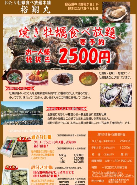 世古牡蠣店 http://www.sekokakiten.jp/alleat.html 11時30分からの予約 http://www.sekokakiten.jp/tabe.jpg 气水湖で育った牡蠣で磯くささが無く あまり塩辛くない牡蠣です。 参考ルート https://maps.app.goo.gl/EyjjdTh2UiVyV2qR7 途中離脱O.K. マイミクさん2人参加します。 3110さん ジョルノさん