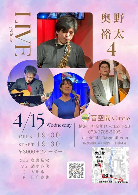 日時:4月15日(水)open 19:00 / start 19:30- 場所:大口circle https://otokukan-circle.my.canva.site/ MC:3,000円☆2品以上のご注文をお願いします☆ メンバー:a.sax/奥野裕太 gt/太田希 ba/日向克典 vo/清水方代 今週はふたつのユニットからお声がけいただいて、大口circleで2デイズ☆ 明後日4/15(水)は19時半からサックス奥野裕太グループで演奏します♪ メンバーはそれぞれいろいろな企画ですでに大口circleに出演していますが、裕太さんグループでは初出演! 今回は残念ながらピアノの菊地さんが欠席なので、カルテットでの
