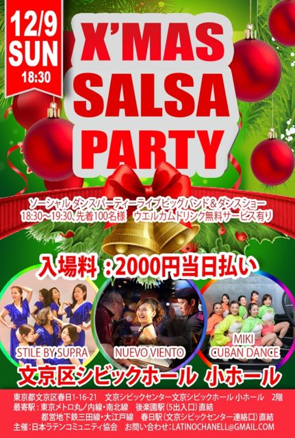 12·î9Æü¡ÊÆü¡ËX'MAS SALSA LIVE PARTY ʸµþ¶è¥·¥Ó¥Ã¥¯¥»¥ó¥¿¡¼¾®¥Û¡¼¥ë¡¡2³¬¡¡18¡§30¡¡¡Á¡¡21¡§30 ¡¡ Åìµþ¤Èʸµþ¶è½ÕÆü1-16-21 ºÇ´ó±Ø¡¡Åìµþ¥á¥È¥í´Ý¤ÎÆâÀþ¡¦ÆîËÌÀþ¡¡¸å³Ú±à±Ø¡Ê5½ÐÆþ¸ý¡¡Ä¾·ë¡Ë ÅÔ±ÄÃϲ¼Å´»°ÅÄÀþ¡¦Âç¹¾¸ÍÀþ¡¡½ÕÆü±Ø¡Êʸµþ¥·¥Ó¥Ã¥¯¥»¥ó¥¿¡¼Ï¢Íí¸ý¡¡Ä¾·ë¡Ë ¼çºÅ¡¡¡¡ÆüËܥ饯¥ó¥³¥ß¥å¥Ë¥Æ¥£¶¨²ñ ¡¡¡¡¡¡¡¡¡¡ DJ¡¡¥ë¥¤¥¹¡¡¡ÊLatinoChanell¡Ë ¡¡¡¡¡¡¡¡ Æþ¾ìÎÁ¡¡¡¡2000±ß¡¡¡¡¡¡¥Ð¥ó¥É¥é¥¤¥Ö¡¡2ÁȤΥÀ¥ó¥¹¥·¥ç¡¼ÉÕ¤¡¡