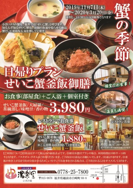 今年で3回目になるせいこ蟹シリーズ、丼→香箱の次は釜飯にしました。料理を食べ温泉に入って個室でゆっくり出来る宿は何軒かありますが、お風呂の数が多い、しきぶ温泉 湯楽里(ゆらり)が良いと思います。 http://yurari-yu.jp/ せいこ蟹釜飯御膳(個室、温泉付き)、他に天婦羅、味噌汁、香の物で3,980円の予定。 安い分、バスタオル、タオルは付いていませんのでお持ち下さい。 マキノ高原のメタセコイア並木を通り、波の花を見て、湯楽里に入ろうと思います。帰りに出雲大社福井分院、越前そばの里に寄ります。 レンタカー代25,200、高
