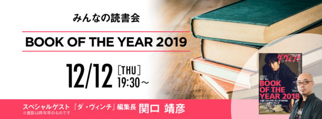 12·îºÇ¸å¤ÎÆÉ½ñ²ñ¡£¤ªÂê¤Ï¡È¤ß¤ó¤Ê¤¬Áª¤Öº£Ç¯¤Î°ìºý¡É º£Ç¯ÆÉ¤ó¤ÀËܤǡ¢À§Èó¤Þ¤ï¤ê¤Ë´«¤á¤¿¤¤°ìºý¤ò¸ì¤ê¹ç¤¤¤Þ¤·¤ç¤¦¡£ ¤¤Ã¤È¡¢ÉáÃʤÀ¤Ã¤¿¤é¼ê¤Ë¼è¤é¤Ê¤«¤Ã¤¿ËܤȤνй礤¤¬¤¢¤ë¤Ï¤º¤Ç¤¹¡£ ¥¹¥Ú¥·¥ã¥ë¥²¥¹¥È¤Ï¡¢Ëܤȥ³¥ß¥Ã¥¯¤Î¾ðÊó»ï¡Ö¥À¡¦¥ô¥£¥ó¥Á¡×ÊÔ½¸Ä¹¤Î´Ø¸ýÌ÷ɧ¤µ¤ó¡£ 12·îȯÇä¤Î¡ÖBOOK OF THE YEAR¡×ÆÃ½¸¤ÎÉñÂæ¥¦¥é¤òÌÀ¤«¤·¤Ä¤Ä¡¢ ´Ø¸ý¤µ¤ó¤äÊÔ½¸Éô°÷¤Ë¤È¤Ã¤Æ¤Î¡Ö¥Þ¥¤¡¦¥Ù¥¹¥È¡¦¥Ö¥Ã¥¯¥ª¥Ö¥¶¥¤¥ä¡¼2019¡× ¤ò¸ì¤Ã¤Æ¤¤¤¿¤À¤¤Þ¤¹¡£ --------------------------------------------------------------------------------------------