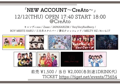 ¡ÖNEW ACCOUNT¡ÁCreAto¡Á¡× Æü»þ¡§12/12(ÌÚ) ³«¾ì17:40 / ³«±é18:00 ²ñ¾ì¡§·ÃÈæ¼÷CreAto ÎÁ¶â¡§Á°Çä1,500±ß / ÅöÆü2,000±ß (DÊÌ) ½Ð±é¡§¥¥ã¥ó¥Ç¥£zoo / Zsasz / JAPANARIZM / BOY MEETS HARU / VeryVeryRedBerry / »°Æü·î¥¹¥Ê¥¤¥Ñ¡¼ / Ì´¸¸¥¯¥ì¥Ã¥·¥§¥ó¥É / MELTY HZ / ¤ì¤¤¤ó17