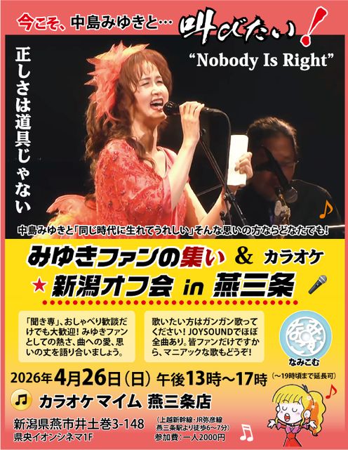 中島みゆきと 『同じ時代に生まれてうれしい』 そんな思いの方ならどなたでも! 中島みゆき曲しばりのカラオケオフ会、開催します。 □時:4月26日(日)午後13時〜17時(19時頃まで延長可・途中入退出自由) □所:カラオケマイム燕三条店 燕市井土巻3-148イオンシネマ・ワーナーマイカル1F(飲食物の持ち込みは不可です) □参加費:1人 2000円 歌うもよし、歌わないでおしゃべり歓談だけもよし。ファン歴の長短にかかわらず、みゆきソングへの思いや、コンサート夜会などの思い出話に花を咲かせましょう! ※参加ご希望の方は下記ライ