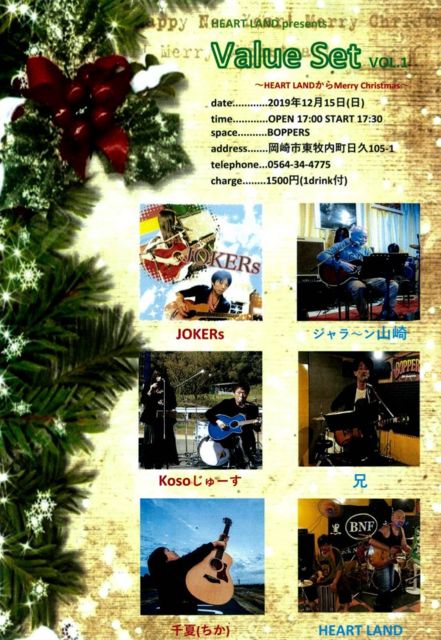 HEART LAND presents Value Set vol.1 〜HEART LANDからMerry Christmas〜 date 2019年12月15日(日) time OPEN 17:00 START 17:30 space BOPPERS address 岡崎市東牧内町日久105-1 telephone 0564-34-4775 charge 1500円(1drink付) JOKERs ジャラ〜ン山崎 Kosoじゅーす 兄 千夏(ちか) HEART LAND