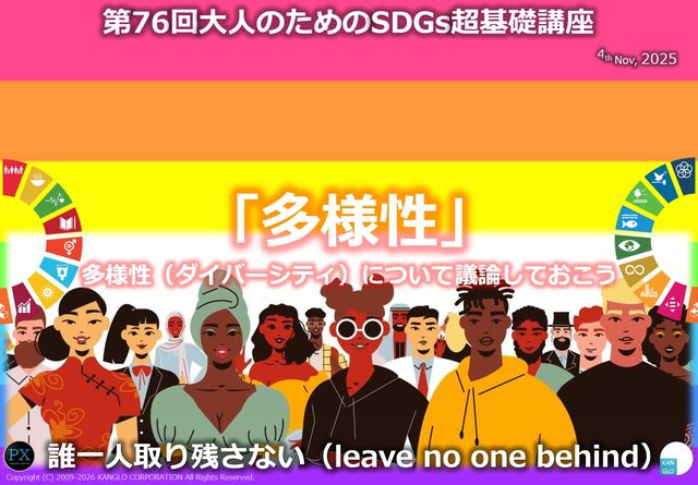 多様性〜多様性(ダイバーシティ)について議論しておこう/第76回大人のためのSDGs超基礎講座(2025年11月4日) チケット https://kanglo-sdgs251104.peatix.com/view https://www.facebook.com/events/2341718049591185 --------------------------- 2015年9月25日、国連総会にてSDGsが採択され、あれからすでに10年が経とうとしています。人類は、21世紀に積み残してしまった地球全体の危機的課題の解決に向けてどれ程前進できたのでしょうか?SDGsは、人類史上初の世界規模における共通目標として始まりました。期限は2030年です。この時