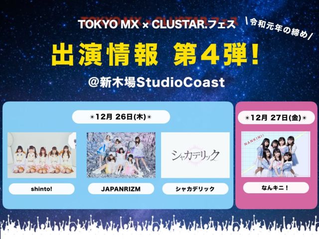 ¡ÖTOKYO MX ¡ß CLUSTAR.¥Õ¥§¥¹¡× Æü»þ¡§12/26(ÌÚ) ³«¾ì12:30 / ³«±é13:00 ²ñ¾ì¡§¿·Ìھ쥹¥¿¥¸¥ª¥³¡¼¥¹¥È ÎÁ¶â¡§Ä̾ï4,000±ß / VIP10,000±ß / ³ØÀ¸3,000±ß / Áá³ä2,500±ß LIVE POCKET¡§https://t.livepocket.jp/t/tokyomx-clustarfes