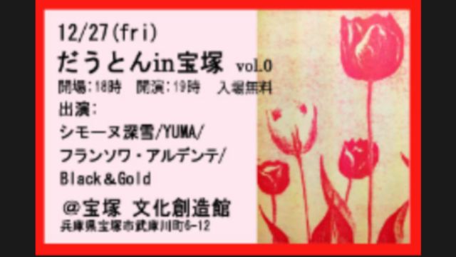 ¤À¤¦¤È¤ó in Zucca vol.00 2019 12 27 fri @ÊõÄÍʸ²½ÁϤ´Û¡¡ 18:30 ³«¾ì¡¡19:00 ³«±é¡¡ ¡ï̵ÎÁ ½Ð±é: ¥·¥â¡¼¥Ì¿¼Àã/YUMA/¥Õ¥é¥ó¥½¥ï¡¦¥¢¥ë¥Ç¥ó¥Æ/¥Á¥Þ¥¡¡¤Û¤«¡¡