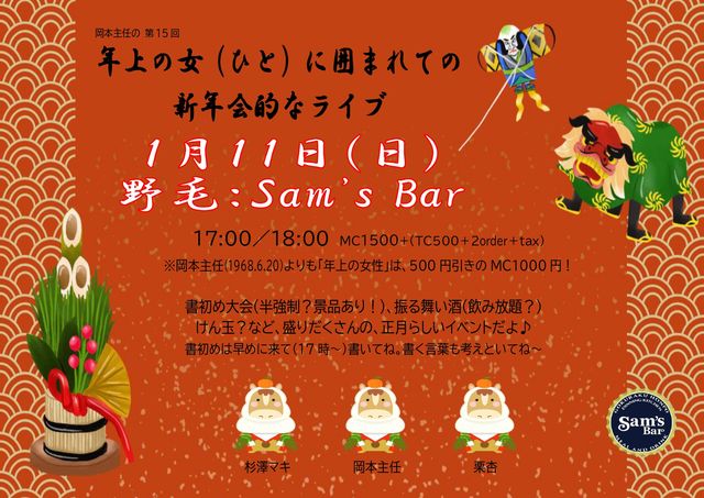 ¡ü³µÍ× £±·î£±£±Æü¡ÊÆü¡Ë ÌîÌÓ¡§Sam's Bar http://www7b.biglobe.ne.jp/~samsbar ²¬ËܼçǤ¤ÎÂè15²ó¡Öǯ¾å¤Î½÷¡Ê¤Ò¤È¡Ë¤Ë°Ï¤Þ¤ì¤Æ¤Î¿·Ç¯²ñŪ¤Ê¥é¥¤¥Ö¡× 17:00/18:00 MC1500+(TC500¡Ü2order¡Ütax¡Ë ¢¨¼çǤ(1968.6.20)¤è¤ê¤â¡Öǯ¾å¤Î½÷À­¡×¤Ï¡¢500±ß°ú¤­¤ÎMC1000±ß¡ª ½Ð±é¡§¿ùß·¥Þ¥­¡¢·ª°É¡¢²¬ËܼçǤ ¡üÆâÍÆ ½ñ½é¤áÂç²ñ¡¢¿¶¤ëÉñ¤¤¼ò¡¢¤±¤ó¶Ì¡©¤Ê¤É¡¢À¹¤ê¤À¤¯¤µ¤ó¤Î³Ú¤·¤¤¥¤¥Ù¥ó¥È¥é¥¤¥Ö¤Ç¤¹¢ö ¢¨½ñ½é¤á¡áȾ¶¯À©¡©»²²Ã¾Þ¤¢¤ê¡ªÁá¤á¤ËÍè¤Æ¡Ê17»þ¡Á¡Ë½ñ¤¤¤Æ¤Í¡£½ñ¤¯¸ÀÍÕ¤â¹Í¤¨¤È¤¤¤Æ¤Í¡Á¡£ ¡ü¥¿¥¤¥à¥¹¥±¥¸¥å¡¼¥ë 18:00¡¡¿·Ç¯¤Î°§»¢ 18:05¡¡