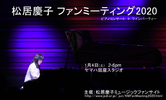 松居慶子ファンミーティング2020 1月4日 (土) 2〜6pm 集合 13:40 開場 14:00 1部:ソロピア ノコンサート(60分) 着席 2部:ワインパーティー & サイン会 (120分) 立食 閉会 18:00 【使用ピアノ】 YAMAHA - CFX 【会 場】 ヤマハ銀座スタジオ 東京都中央区銀座7丁目9-14 ヤマハ銀座店 B1 ⇒アクセス 銀座駅A3出口より徒歩4分 新橋駅より徒歩7分 https://www.yamahaginza.com/access/ 【参 加費】 12,000円 (シャンパン、ワイン、ソフトドリンク、フィンガーフード、記念グッズ付) 同伴に限り学