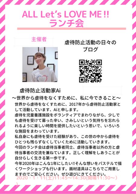 ¼«¿È¤ËµÔÂԷи³¤¬¤¢¤ê¡¢µÔÂÔ¤òÀ¤³¦¤«¤é¤Ê¤¯¤·¤Æ¤¤¤¯¤¿¤á¤Ë¡¢ÍÍ¡¹¤Ê³èư¤ò¤µ¤»¤Æ¤¤¤¿¤À¤¤¤Æ¤Þ¤¹¡£ ¤½¤Î³èư¤Î°ì´Ä¤È¤·¤Æ¡¢ »ùƸÍܸî»ÜÀߤΤ³¤É¤â¤¿¤Á¤Ø¥Ñ¥¹¥Æ¥ë²è¤ò¶µ¤¨¤ë¥Ñ¥¹¥Æ¥ë²è¶µ¼¼¤Î³«ºÅ¡¢ ¤½¤Î¤³¤É¤â¤¿¤Á¤¬ÉÁ¤¤¤¿ºîÉʤΟ¼¨²ñ¤Î´ë²è¤È³«ºÅ¡¢ µÔÂԷи³¼Ô¤Îµï¾ì½ê¤Å¤¯¤ê¤Î¥¤¥Ù¥ó¥È³«ºÅÅù¤ò¹Ô¤Ã¤Æ¤Þ¤¹¡£ ËÜÆü¤Ï¡¢2020ǯºÇ½é¤Î¥é¥ó¥Á²ñ³«ºÅ¤Î¤´°ÆÆâ¤Ç¤¹¡£ ALL Let's LOVE ME!!¥é¥ó¥Á²ñ 1/11(ÅÚ) 11:45¡Á14:30(11:30³«¾ì¡Á¡¢ÅÓÃæÂà½Ð²Äǽ¡¢14:45´°Á´Å±¼ý) ¾ì½ê:¿·½É»°ÃúÌÜÉÕ¶á(¾ì½ê¤Î¾ÜºÙ¤Ï¤ª¿½¤·¹þ¤ß¼Ô¤Ë¸åÆü¤ªÅÁ¤¨¤·¤Þ¤¹)¡¡ »²²Ã