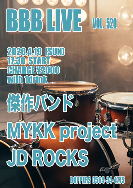 BBB LIVE 520 2026.4.19 (SUN) 17:30 START CHARGE \2000 with 1drink ·æºî¥Ð¥ó¥É MYKK project JD ROCKS