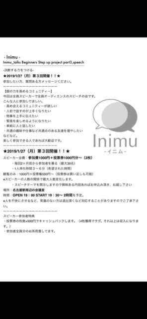 - Inimu - Inimu_talks Beginners Step up project part3,speech ¡¼¡¼¡¼¡¼¡¼¡¼¡¼¡¼¡¼¡¼¡¼¡¼¡¼¡¼¡¼¡¼¡¼¡¼¡¼¡¼¡¼¡¼¡¼¡¼¡¼¡¼¡¼¡¼¡¼¡¼¡¼¡¼¡¼¡¼¡¼¡¼¡¼¡¼¡¼¡¼ -·èÃǤ¹¤ëÎϤò¤Ä¤±¤ë- ¡ú2019/1/27¡Ê·î¡ËÂ裳²ó³«ºÅ¡ª¡ª¡ú »²²Ã¤·¤¿¤¤Êý¡¢¼ÁÌ䤢¤ëÊý¥á¥Ã¥»¡¼¥¸¤¯¤À¤µ¤¤¡£ ¡¼¡¼¡¼¡¼¡¼¡¼¡¼¡¼¡¼¡¼¡¼¡¼¡¼¡¼¡¼¡¼¡¼ ¡Ú¸Ä¤ÎÎϤò¹â¤á¤ë¥³¥ß¥å¥Ë¥Æ¥£¡¼¡Û º£²ó¤ÏÁ´°÷¥¹¥Ô¡¼¥«¡¼¤ÇÁ´°÷¥ª¡¼¥Ç¥£¥¨¥ó¥¹¤Î¥¹¥Ô¡¼¥Á¤Î²ñ¤Ç¤¹¡£ ¤³¤ó¤Ê¿Í¤Ë»²²Ã¤·¤Æ¤Û¤·¤¤¡£ ¡¦¹â¤á²ñ¤¨¤ë¥³¥ß¥å¥Ë¥Æ¥£¡¼¤¬Íߤ·¤¤ ¡¦¿ÍÁ°¤ÇÏ乤Τ¬¾å¼ê¤¯¤Ê¤ê¤¿¤¤ ¡¦Êª»ö¤ò¾å¼ê¤ËÅÁ¤¨¤¿¤¤ ¡¦¶ÛÄ¥¤ò³Ú¤·¤á¤ë¤è¤¦¤Ë¤Ê