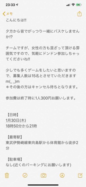 始まりは19:00過ぎになる可能性が高いため、遅れての参加も歓迎します! お世辞になります、ワダと申します。 木曜日の夕方に梅ヶ丘・東松原・明大前付近にあります中学校の体育館を確保しましたので、ご一緒にミックスバスケをしてくたざる方を数名募集します。 エンジョイバスケですので、女性や初心者の方も歓迎します。ガチの方はご遠慮ください。 集まり次第ゲームします。 参加される方は性別・人数をご記載のうえ、コメントかメッセージをお願いします。 日時:1月30日(木) 18:45〜21:00 (20:45終了) 場所:世田谷区立梅