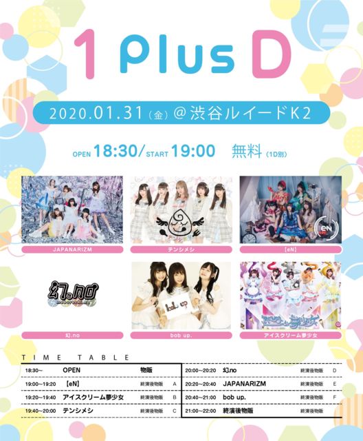 「1Plus D」 日時:01/31(金) 開場18:30 / 開演19:00 会場:渋谷RUIDO K2 料金:無料 (D別600円) 出演:【en】/アイスクリーム夢少女/テンシメシ/幻.no/JAPANARIZM/bob up. 出演:20:20〜20:40 物販:終演後 21:00〜22:00 (E)