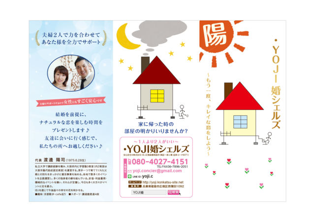 大阪の皆様、告知、失礼致します。 ・YOJI婚シェルズの渡邊と申します。 私どもは1人でも多くの独りの方同士の縁をつないでおります。 2月8日に堺東駅前のイベントスペースで20代後半・30代対象に【そろそろ結婚を考えてますよ♪パーティー】を、29日(土)には女性40代限定・男性40代・50代対象【落ち着いた大人の婚活プチお見合い会】を開催致します。 イベント詳細・料金・お申込みは弊社サイトよりお願い致します。 http://yoji.konkatsu-site.net/ また、弊社は婚活事業で唯一の東証1部上場 IBJ(証券コード6071)の正規窓口となっておりま