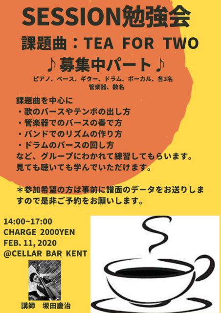 今月は通常セッションと勉強会を開催いたします。 2日が通常セッション 11日が勉強会です。 勉強会は後、1バンド分のメンバーを募集してます 興味のある方は是非ご予約を 来月は3月21日に開催します 参加料:1500円+ドリンク代(見学者も同じです。 オープン13:45 スタート14:00〜17:00 ※当日飛び込み参加も大歓迎です。 お店にはPA、エレピ、ギターアンプ、ベースアンプ、ドラム、譜面台などはあります。 このセッションは同じ曲を何回やっていただいても構いません。 メンバーの編成を変えてみたり、テ