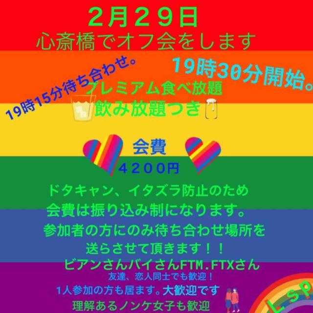 今回はプレミアム食べ放題コースです((^o^) もちろん‼️ 飲み🍺放題つき🍻 海鮮料理が多めの店になっています😁 もちろん居酒屋メニューも多数ございます👌 2月29日(土曜) 19時半〜3時間 心斎橋で行います❗️ 待ち合わせは店のビル前に (1)(9)時(1)(5)分でお願いします🥺 セクマイの友達や もちろんノンケ(ストレート)の理解者の女子も 参加も大歓迎♪〜(゚ε゚( ) 〜♬ もちろんパートナーや恋人さんとも😁 会費 (4)(2)(0)(0)円 今回も振り込み式になります。 お