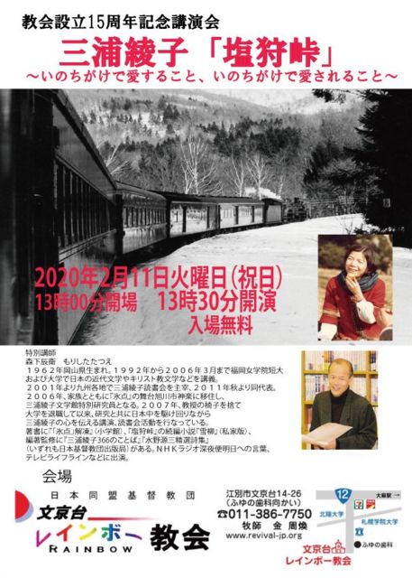 【三浦綾子読書会からのお知らせ】 江別市で三浦綾子文学講演会が開かれます。 講演:三浦綾子「塩狩峠」 〜いのちがけで愛すること、 いのちがけで愛されること〜 講師:森下辰衛三浦綾子読書会代表 三浦綾子記念文学館特別研究員 日時:2020年2月11日(火曜日・祝日) 13:00開場 13:30開演 会場:日本同盟教団 文京台レインボー教会 〒069-0833 北海道江別市文京台14-26 http://revival-jp.org/access.html 貼付地図もご参照ください 入場:無料 190