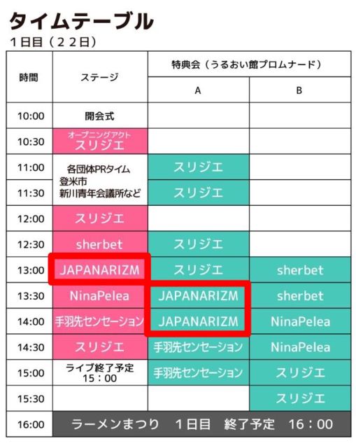 「入善ラーメンまつり にゅうぜん アイドル フェスティバル」http://www.nyuzen.jp/ramen2020.shtml#idol 日時:02/22(土) 会場:富山県 入善まちなか交流施設うるおい館前特設会場 料金:無料 出演:スリジエ / sherbet / JAPANARIZM / Nina Peiea / 手羽先センセーション 出演:13:00〜13:30 物販:13:30〜14:30 撮影可能