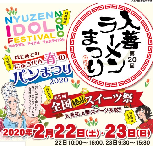 「入善ラーメンまつり にゅうぜん アイドル フェスティバル」http://www.nyuzen.jp/ramen2020.shtml#idol 日時:02/22(土) 会場:富山県 入善まちなか交流施設うるおい館前特設会場 料金:無料 出演:スリジエ / sherbet / JAPANARIZM / Nina Peiea / 手羽先センセーション 出演:13:00〜13:30 物販:13:30〜14:30 撮影可能