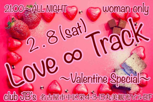 🍫2.8(土)🍫 CandyStrap Presents Woman Only Party LOVE∞TRACK 〜Valentine Special!〜 [OPEN] 21時〜ALL NIGHT [PLACE]club JB's 名古屋市中区栄4-3-15丸美観光ビルB1F [DOOR] (21時〜2時) ✨当日→3000円(1D) ✨リツイート割→2800円(1D) *受付にてTwitter画面提示* ✨新成人割→2500円(1D) *受付にて身分証提示* (2時〜) ✨当日→2000円(1D) ✨リツイート割→1800円(1D) ✨新成人割→1500円(1D) [DJ] 🎧GUEST DJ🎧 DJ 神奈(アニソン・JPOP DJ) 🎧LOVE∞TRACK